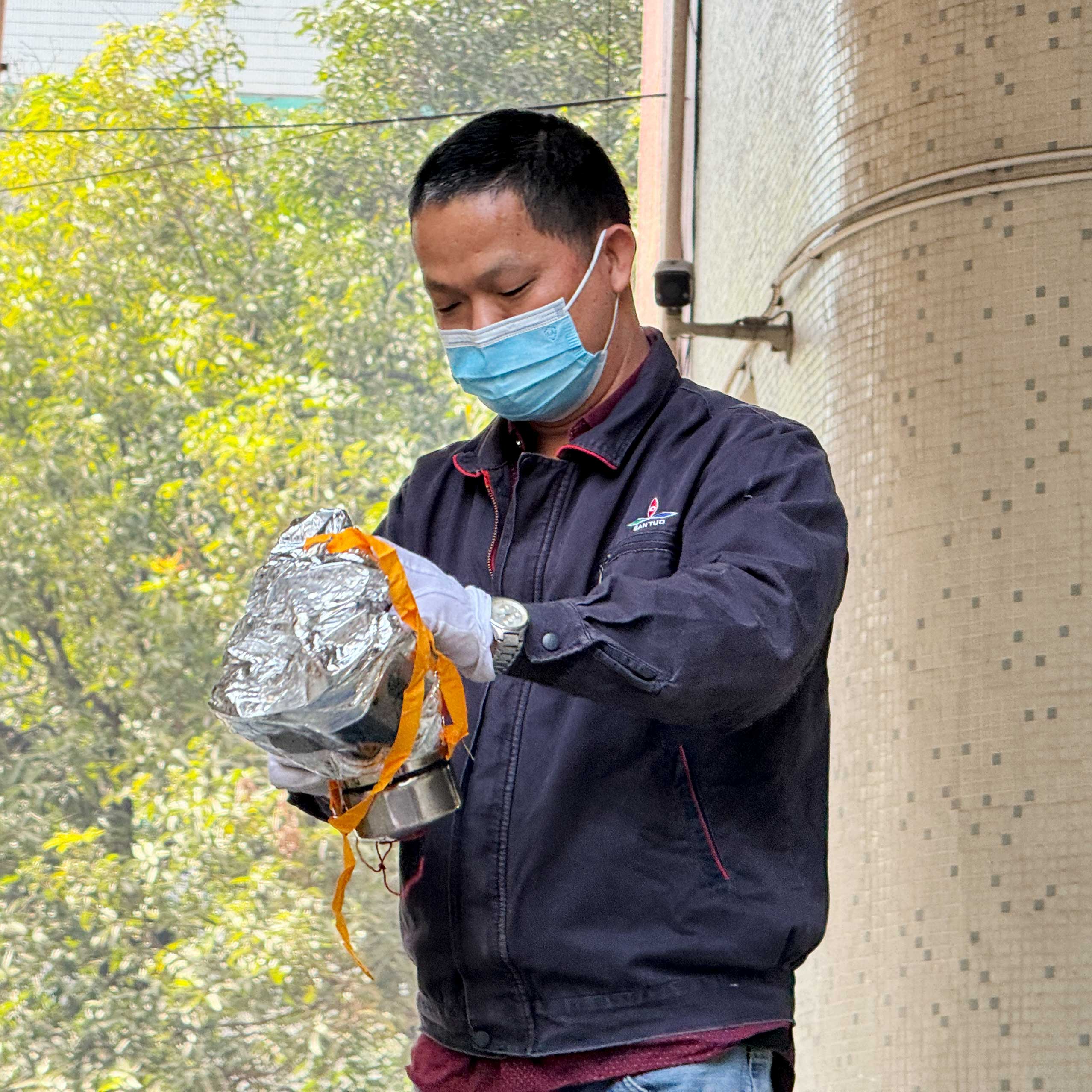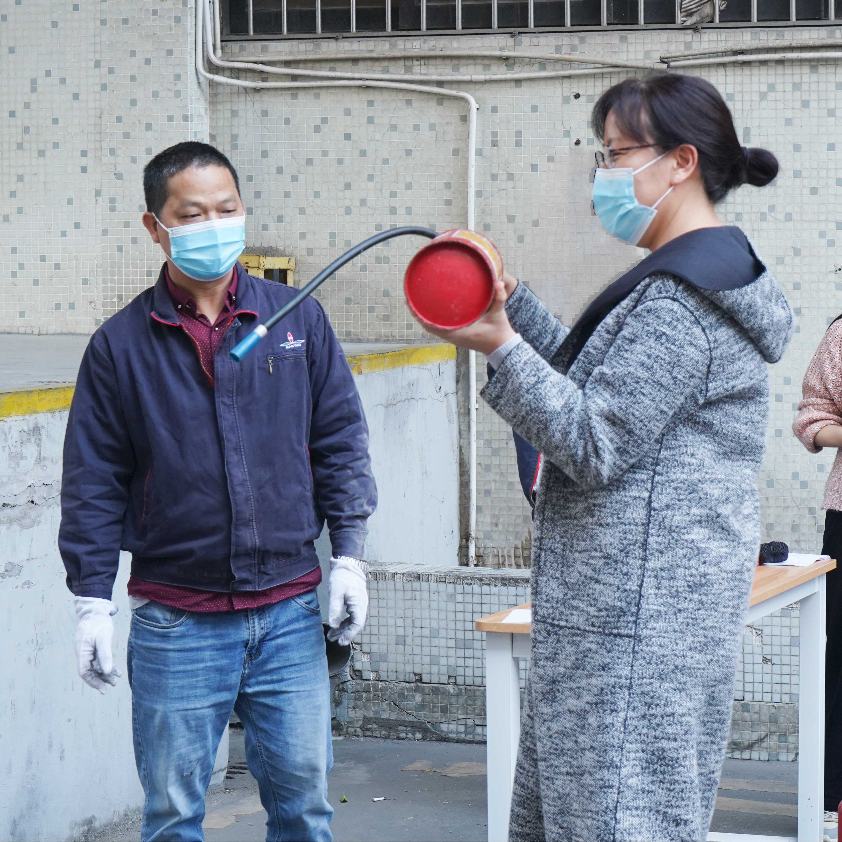 最后,生產(chǎn)部同事依次向大家演示了防毒面具和滅火器的正確操作方法,鼓勵其他同事積極參與嘗試。