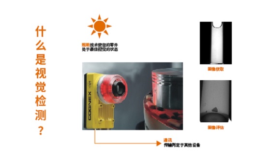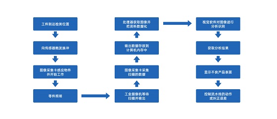 產(chǎn)品工件到達檢驗位置→向傳感器開啟脈沖→圖像采集卡感應物品并開始工作→零部件照明→工業(yè)攝像機等候掃描并輸出→圖像采集卡將數(shù)字圖像儲放到計算機內(nèi)存中→處理器獲取圖片并把資料數(shù)據(jù)化→視覺軟件對圖片進行解析、識別→獲取測定結果→離散輸出,顯示不良產(chǎn)品畫面→控制流水線的動作或糾正偏差。