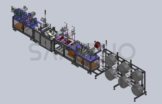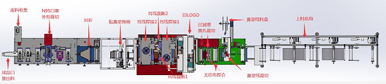 卷材上料→鼻梁條送料→無紡布焊合→過濾塞圓孔裁切(可選配)→印LOGO(可選配)→耳線焊接→貼鼻梁海綿(可選配)→對(duì)折→口罩成型裁切→廢料收集→成品出料。