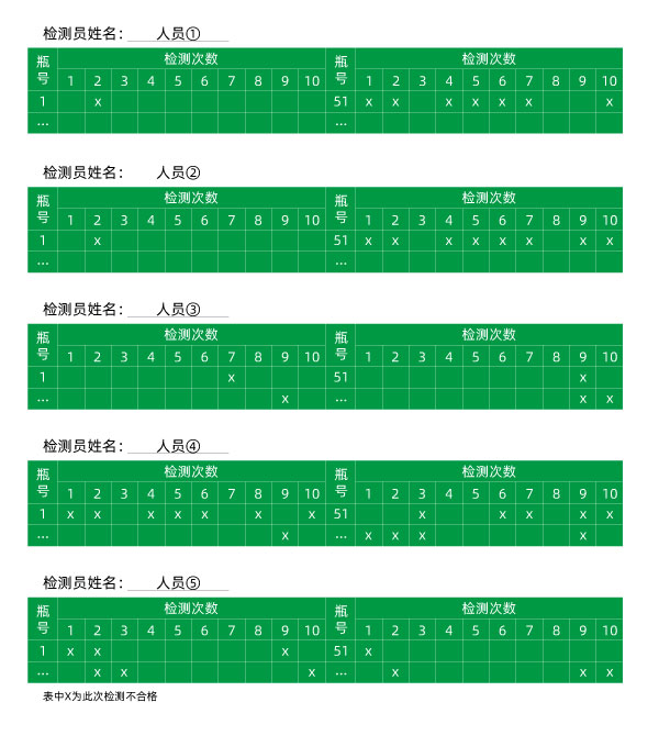 首先是人工檢測(cè)人員的測(cè)試,當(dāng)選5個(gè)可以代表生產(chǎn)廠家平均檢測(cè)水準(zhǔn)的人選,每個(gè)檢測(cè)人員都需要檢測(cè)準(zhǔn)備好的批次十次(每個(gè)批次都會(huì)檢測(cè)50次),檢測(cè)用的產(chǎn)品需要產(chǎn)品瓶子都需要時(shí)一組相同或者標(biāo)準(zhǔn)情況下統(tǒng)一的瓶子,檢測(cè)內(nèi)容和檢測(cè)形式都需要符合標(biāo)準(zhǔn)與實(shí)際情況相符合,這兩點(diǎn)是非常重要的,這樣的檢測(cè)結(jié)果才能和生產(chǎn)實(shí)際情況相近,檢測(cè)數(shù)據(jù)結(jié)果才有意義。另外,不合格的產(chǎn)品要登記記錄到相應(yīng)的帶有編號(hào)的數(shù)據(jù)表中,表中的編號(hào)便是標(biāo)識(shí)瓶子的標(biāo)號(hào)(這項(xiàng)操作需要高一級(jí)的部門來(lái)執(zhí)行,不能有操作者本人執(zhí)行)。