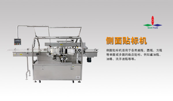 側(cè)面貼標(biāo)機(jī)適用于各類扁瓶、圓瓶、方瓶等單面或多面的商品貼標(biāo),例如醬油瓶、油桶、洗手液瓶等等。