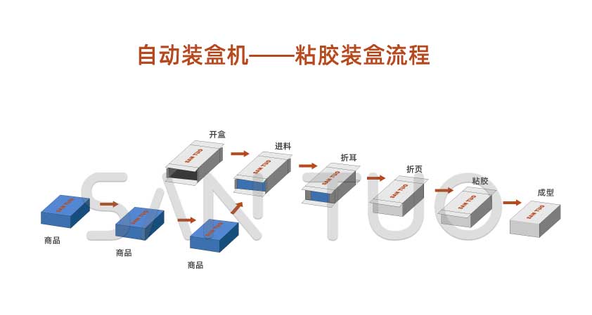 裝盒機(jī)的裝盒過程可分為五個步驟:下料、裝盒、開盒、灌裝和封口。
