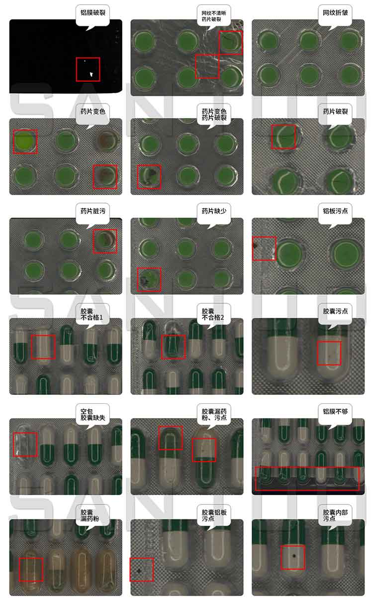 能有效檢測出:泡罩異物、黑點、破損、PVC變形、PVC黑點,PVC折痕、PVC網(wǎng)紋不清、PVC散粉、PVC裁切不齊、字符不清、藥片裂紋、藥片污漬斑塊、藥片缺角、藥片凸起或凹坑等等。