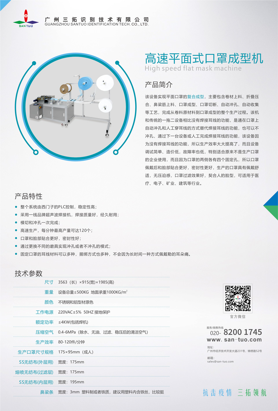 該設(shè)備實(shí)現(xiàn)平面口罩的復(fù)合成型,主要包含卷材上料、折疊壓合、鼻梁筋上料、口罩成型、口罩切斷、自動(dòng)沖孔、自動(dòng)收集等工藝,完成從卷料原材料到口罩成型的整個(gè)生產(chǎn)過(guò)程。該機(jī)和傳統(tǒng)的一拖二設(shè)備相比沒(méi)有焊接耳線的功能,是通在口罩上自動(dòng)沖孔和人工穿耳線的方式替代焊接耳線的功能,也可以不沖孔,通過(guò)下一臺(tái)設(shè)備或人工完成焊接耳線的功能,該設(shè)備因?yàn)闆](méi)有焊接耳線的功能,所以生產(chǎn)效率大大提高了,而且設(shè)備調(diào)試簡(jiǎn)單、造價(jià)低,故障率也低,特別適合原來(lái)不是生產(chǎn)口罩的企業(yè)使用,而且因?yàn)榭谡值膬蓚?cè)各有四個(gè)固定孔,所以口罩佩戴后和臉部貼合更好,密封性更好,生產(chǎn)的口罩具有佩戴舒適,無(wú)壓迫感,口罩過(guò)濾效果好,契合人的臉型,可適用于醫(yī)療、電子、礦業(yè)、建筑等行業(yè)。