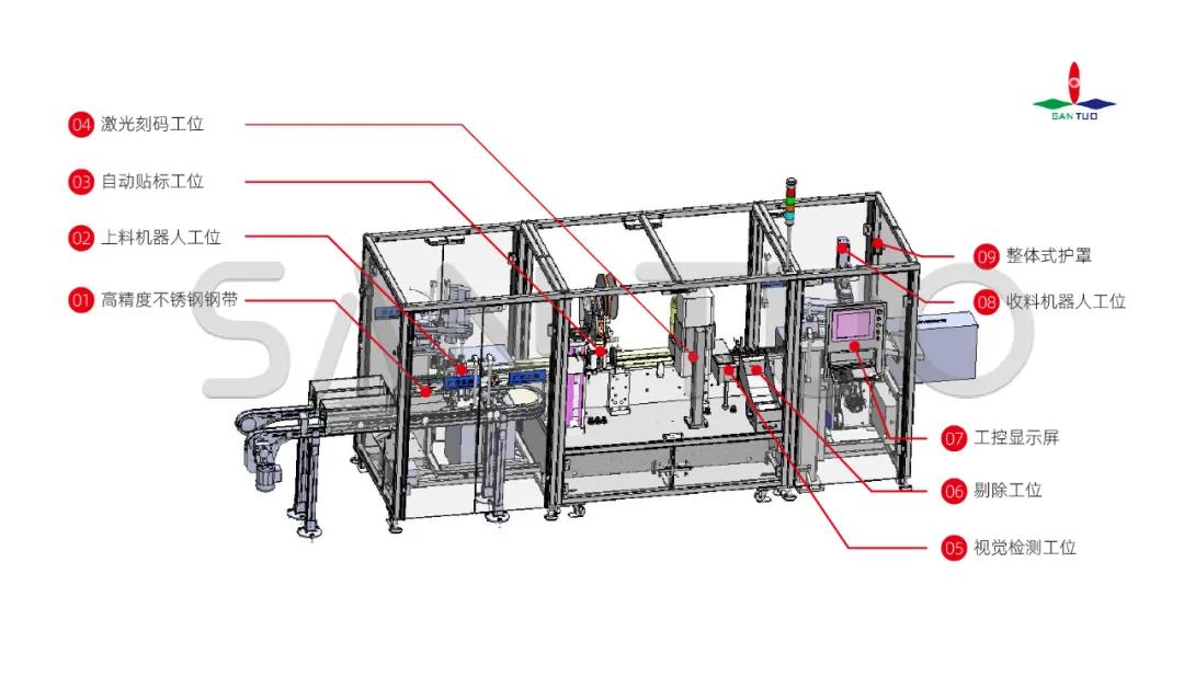 選用康耐視相機(jī)配合三拓自動識別系統(tǒng),在線高速精準(zhǔn)識別貼標(biāo)及刻印精度;